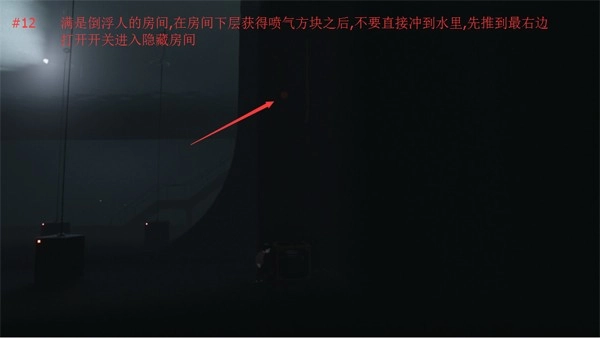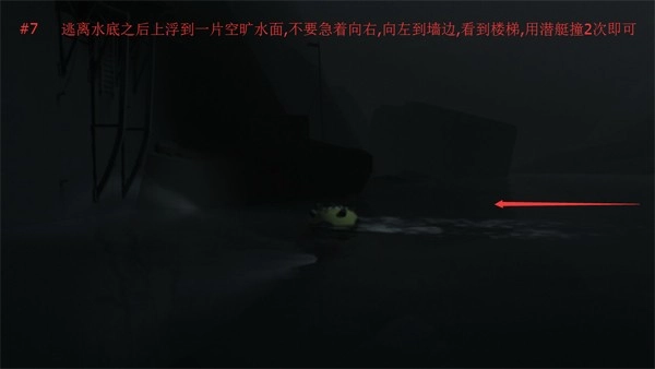 7、逃离水底之后上浮到一片空旷睡眠,不要急着向右,向左到墙边,看到楼梯,用潜艇撞几次即可。