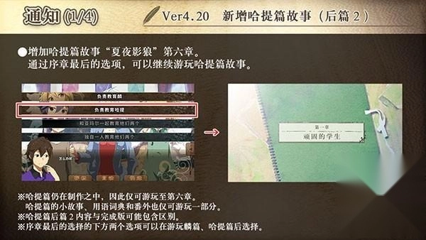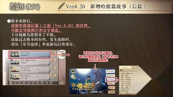 3、版本更新后,读取哈提篇后篇1之前(Ver.4.10)的存档,可能会导致图片和文字混乱。十分抱歉为您带来了不便。读取过去版本的存档,发生故障时,请从【章节选择】界面游玩后续部分。
