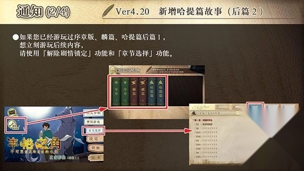 2、如果您已经游玩过序章版、麟篇、哈提篇后篇1,想立刻游玩后续内容,请使用【解除剧情锁定】功能和【章节选择】功能。