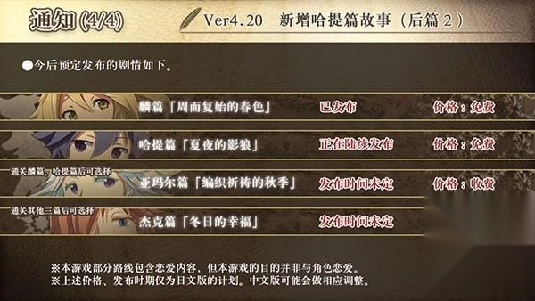 4、以目前v4.20版本来看,麟篇已经完结,并可免费体验全部内容;哈提篇正处于陆续发布阶段,发布完成后也可免费体验全部内容;而亚玛尔篇、杰克篇则正处于未来的更新计划中,发布时间未定,日文版可能会对这两个章节采取收费模式,中文版的话可能会作一定调整。