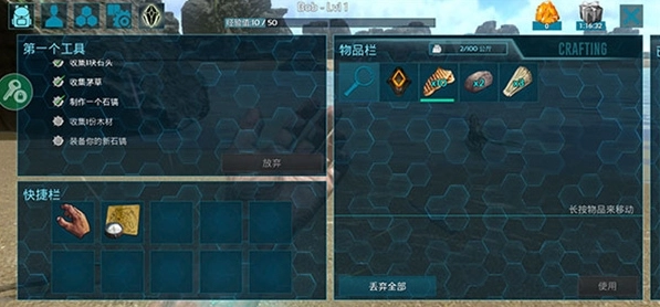3、选择之后就可以开始你的冒险之旅了,刚开始玩家们需要按着右上方的任务进行操作,你需要收集石头、木材等,制作各种武器装备去探索这个世界;