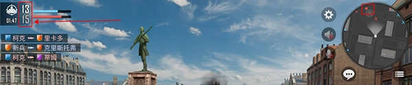 5、正常游戏的比分在左上角显示,在倒计时结束前,哪边队伍先达到人头目标就会获胜,或者倒计时结束后人头多的队伍直接获胜,还有就是在右上角的地图可以看到敌人和队友的动向,红色为敌人,蓝色为队友,白色则是自己。