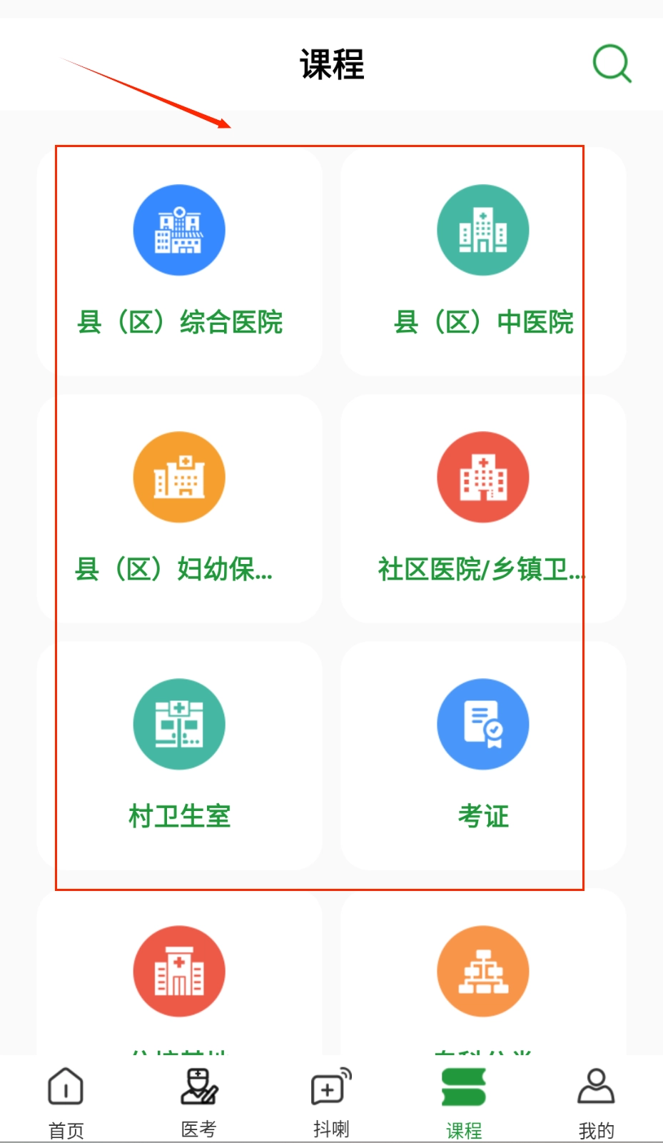 1、查找医疗课程时,点击底部的“课程”图标,接着在绿色分类卡片里选择“县区综合医院”或者“村卫生室”这类标签,通过滑动浏览就可以找到对应的专业内容啦。