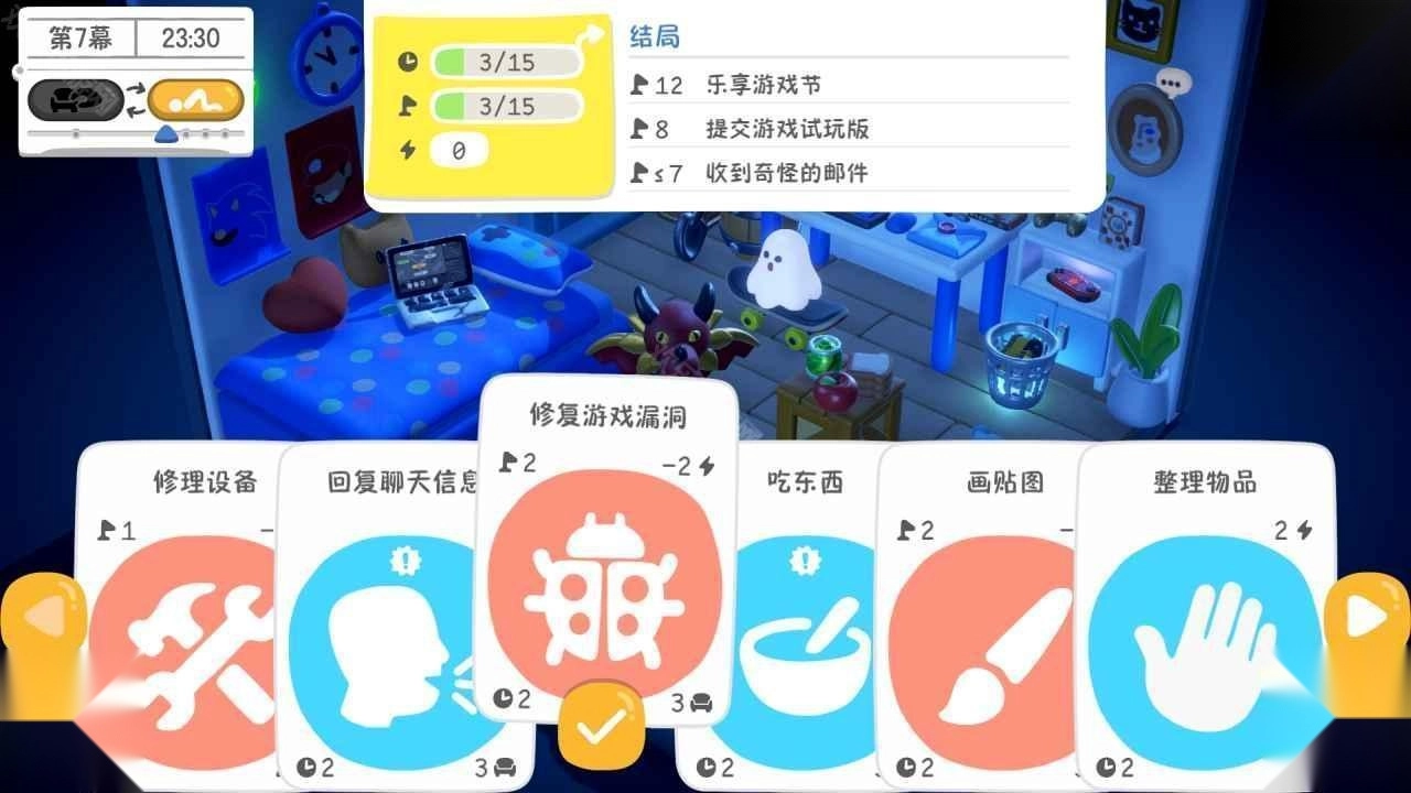 2、创意任务决策系统,通过红蓝卡进行任务管理,红色任务推进目标但消耗体力,蓝色任务恢复体力,需要巧妙的计划通宵策略。