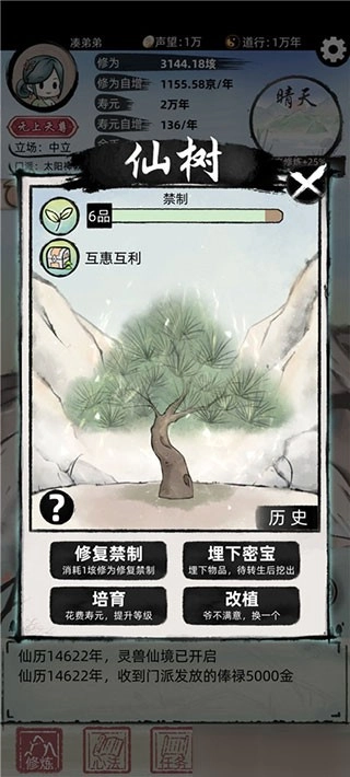 5、转生前,仙树下面可以埋红色三本功法。仙树最好转生后换掉,不然下次转生放的功法容易被偷。禁制转生前最好弄满