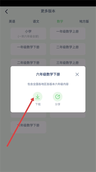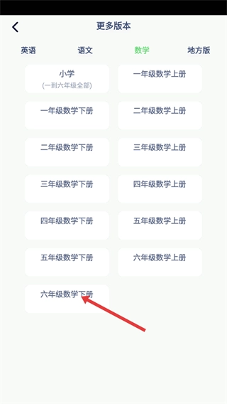 3、在【更多版本】的【数学】分类下,选定学段后,点击【六年级数学下册】,即可切换至该年级下册的学习模块。