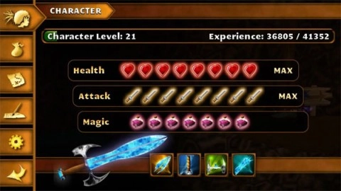 :每个章节终章皆镇守着机制鲜明的强敌BOSS。观察其攻击节奏、弱点暴露时机,灵活切换武器与法术组合,方能以最小代价取胜。击败后必得稀有宝物、传说碎片或专属技能书,直通下一阶段深度养成。人物属性面板清晰呈现战力构成:顶部为HP上限(生存根基)、中部为攻击力(输出核心)、底部为MP上限(技能续航);下方四格预留“传说之剑”碎片槽位——集齐后将触发终极武器觉醒,彻底改写战斗格局。