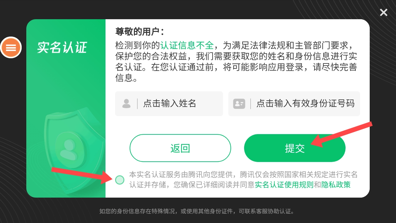 1、玩家启动游戏后,点击【同意】按钮就能进入实名认证界面。