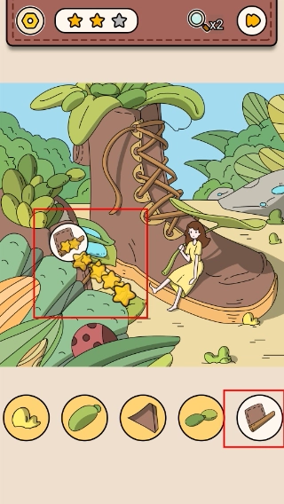 3、将底部选中的【棕色物品】拖到场景靴子旁对应位置,触发星星收集路径,完成该步骤的找物任务。