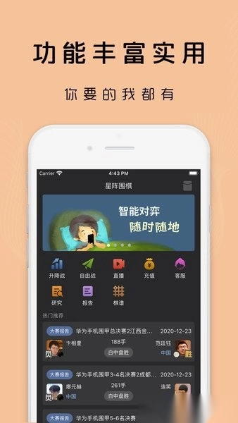 4、升降级对弈中,与星阵真刀真枪的来一盘,净胜两盘一升降。每个等级相差100等级分,时刻反映你的水平提升。