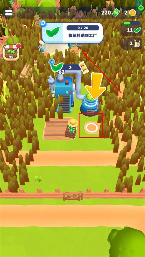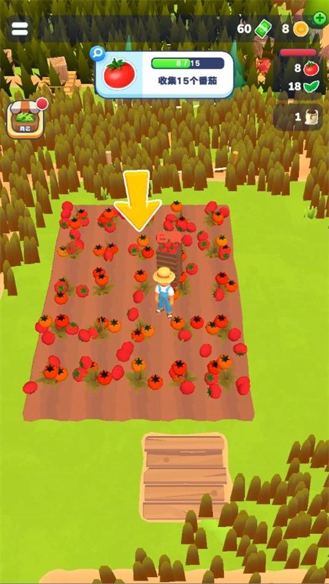 1、启动农场主快开荒中文版游戏后,通过拖动屏幕来控制角色移动,当角色靠近树木时就能采集资源。