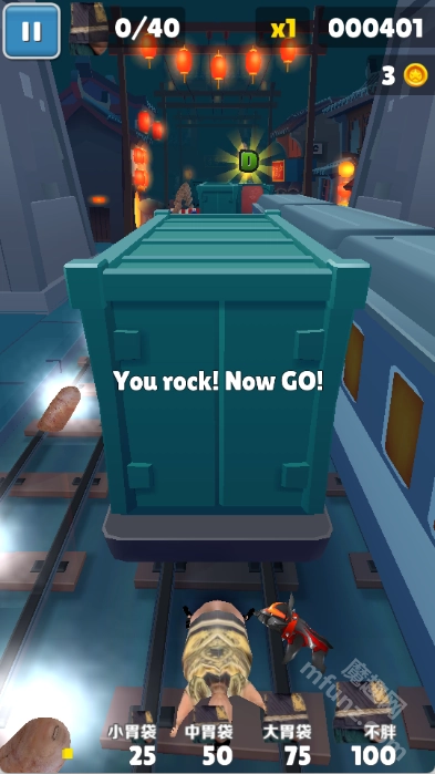 1.在跑酷过程中,赛道上会随机出现金币(焖子),每收集一个金币就能得到一定数量的金币奖励。