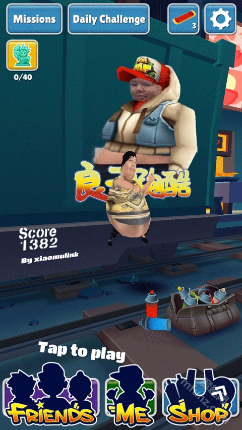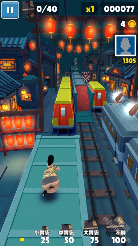 良子跑酷的玩法和其他跑酷类游戏一样,依旧是通过左右滑动来切换轨道、上下滑动实现跳跃和翻滚,但它加入了独特的胃袋血条机制——吃的东西越多就会越胖,一旦胖到卡在洞里就会游戏结束,这种设计的恶搞程度直接拉满。