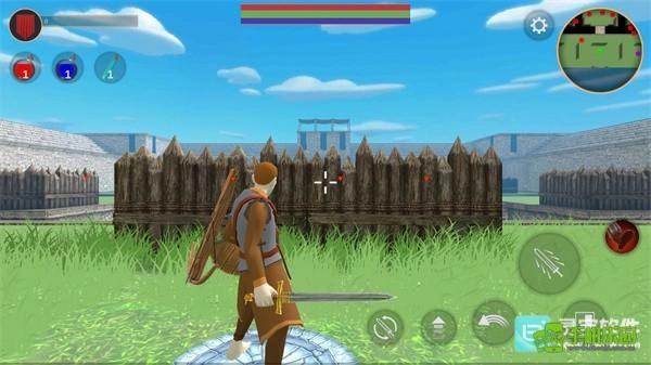 4、当敌人离我们很远时,我们就可以点击下方箭头进行切换弩弓来攻击;