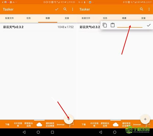 在Tasker主界面中,点击场景选项卡即可切换至场景查看与制作界面;接着点击右下角的“+”按钮,新建一个场景,设置好场景名称后,系统会自动进入场景设计界面。