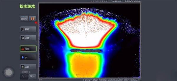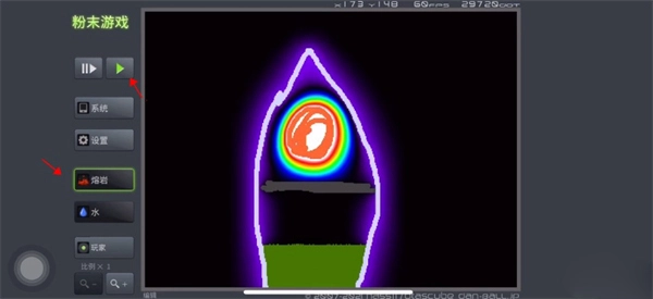 5、点击暂停键,将熔岩放置在金属顶的上方。