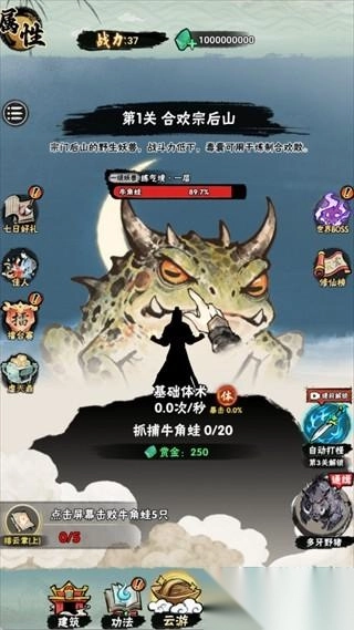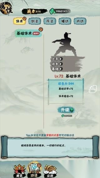 升级体术/剑法等技能,消耗灵石提升攻击、基础武学等属性,增强战力。