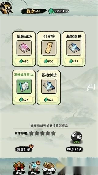 商店可用灵石兑换功法残页、道具,还能刷新货架获取更多资源。