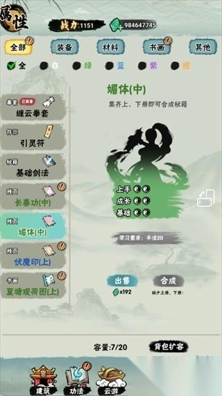 背包可查看已获得的功法残页,集齐对应残页可合成完整秘籍,解锁更强技能。