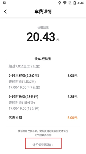 3. 页面会呈现本次行程的详细费用构成,若想了解完整的计价规则,可点击下方的“计价规则详情”。