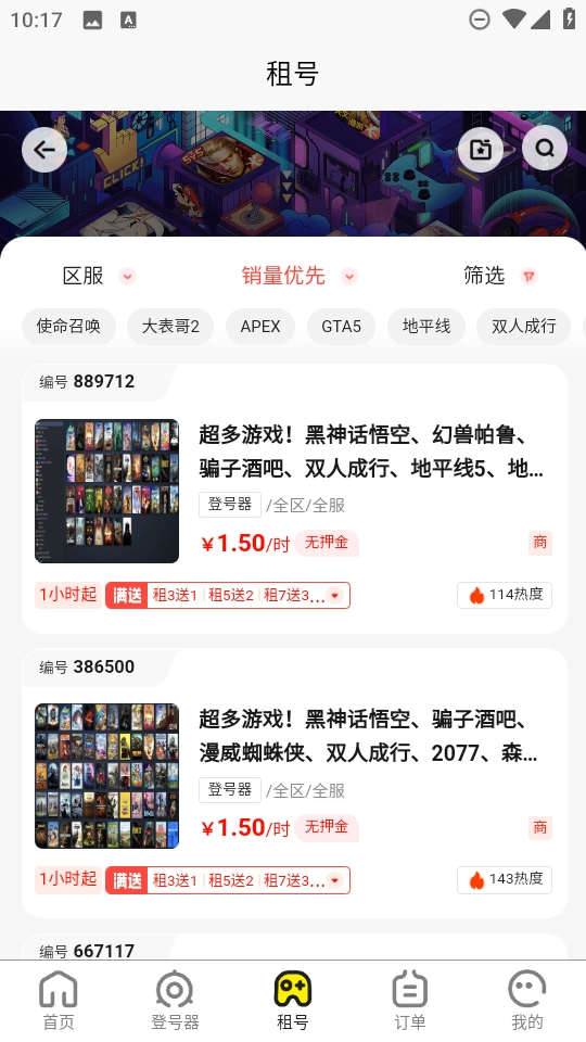 4、新用户注册即可获得免费租号权益与专属红包,热门账号还推出了多租多送的优惠活动。