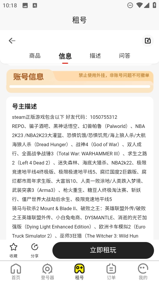 4、根据实际需求,确定好要租赁的账号之后,点击“立即租玩”即可。