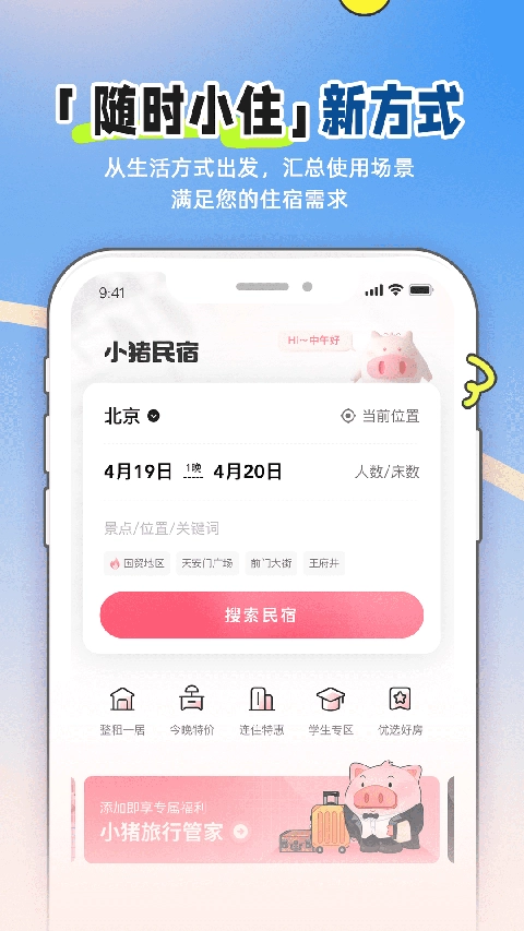 在小猪民宿可以在山海间找到宁静的栖息地,或在市井胡同中享受酣眠;也能入住INS风格的网红民宿,体验老洋房和四合院的独特魅力。从北京到三亚,从海边到深山,从国内到海外,无论是在冰天雪地的漠北,还是在万绿归宗的云南,亦或是精彩纷呈的东南亚,只要您打开小猪,就能找到属于您的特色居所,享受超乎想象的旅行时光。