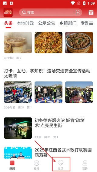 在新闻资讯页面,点击底部导航栏的【生活】选项,就能进入对应的生活服务页面,之后可以使用各类便民功能。