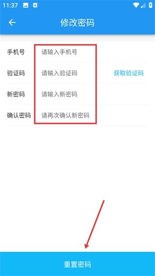 3、在修改密码页面依次填写账号信息、验证码与新密码,填写完成后点击【重置密码】按钮。