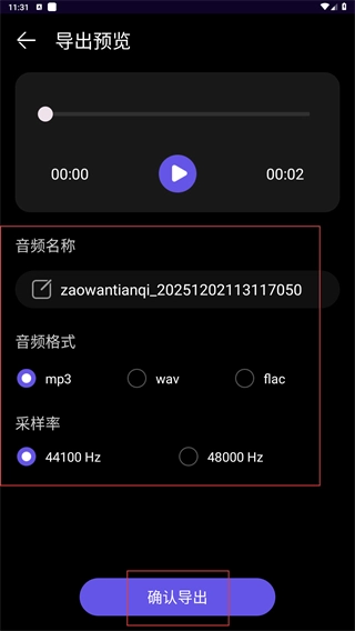 4、在导出预览页,设置音频名称、格式(如mp3)、采样率,确认后点击【确认导出】完成音频导出。