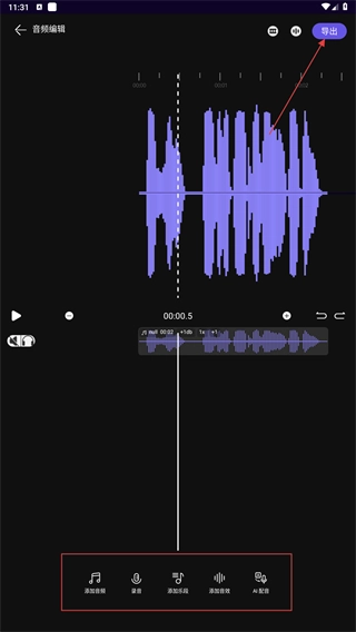3、在音频编辑页,利用【添加音频】【添加音效】等功能编辑音频,完成后点击【导出】进入预览环节。