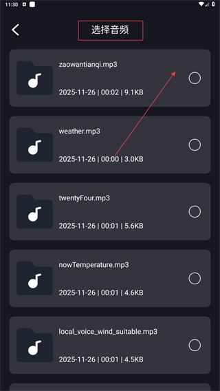 2、在选择音频界面,选择目标音频文件(如【zaowantianqi.mp3】),进入音频编辑页面。