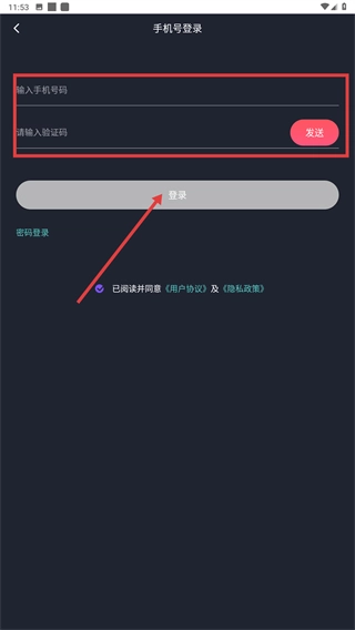 2、在手机号登录页,输入手机号码后点击【发送】获取验证码,填验证码后点击【登录】完成验证登录。