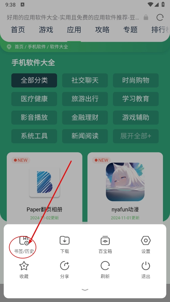 4、然后点击"书签/历史"进入。