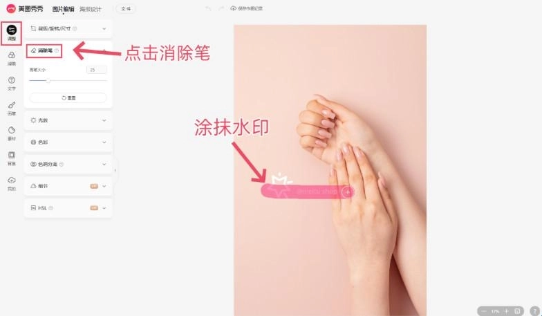 3、接着点击左侧工具栏中的“调整”选项,找到“消除笔”功能,根据需要调整画笔尺寸,用画笔涂抹想要去除的水印部分,这样就完成操作了。