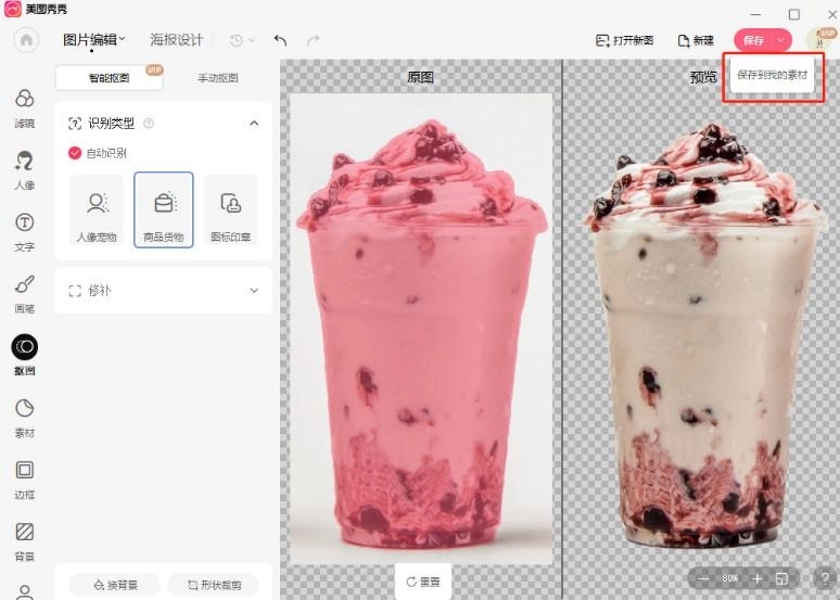 第二步,挑选需要添加的素材图进行智能抠图操作,接着点击右上角保存按钮旁边箭头里的【保存到我的素材】选项。