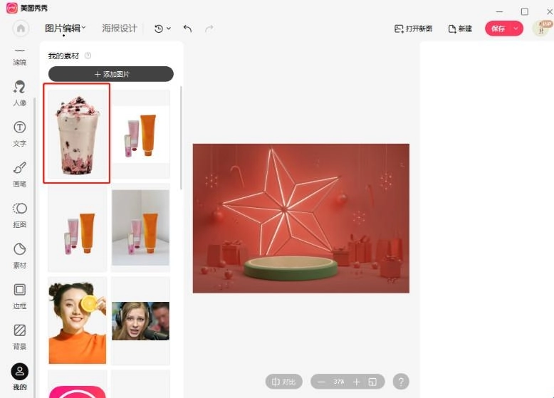 第三步,打开需置于底部的图片,点击左侧工具栏中的“我的”选项,添加刚才抠取的素材图。