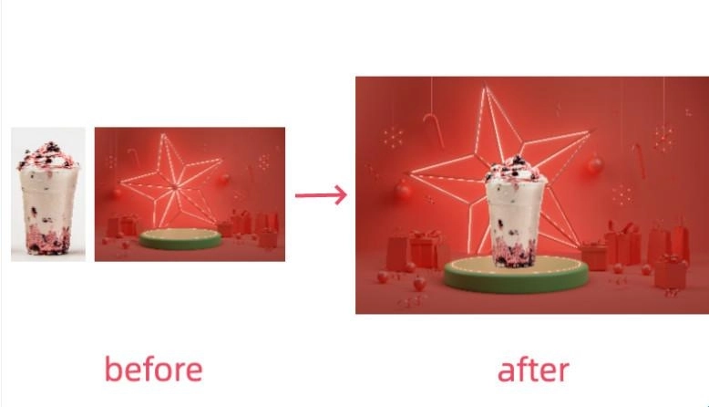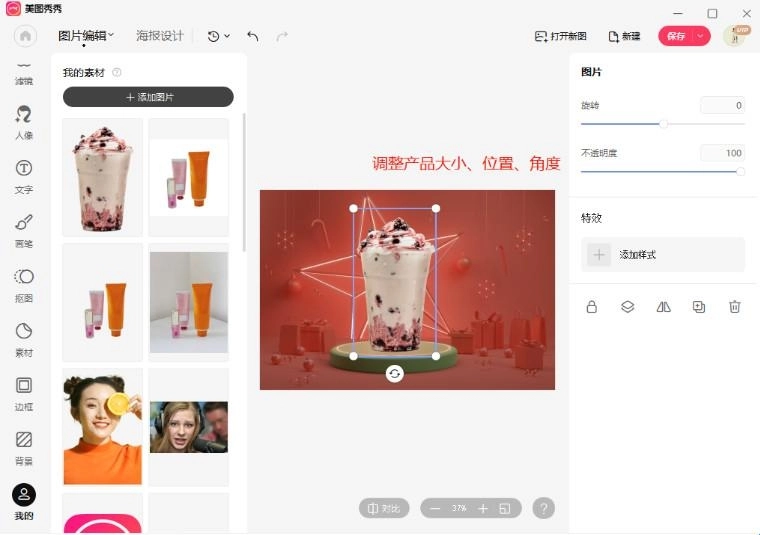 第四步,直接拖动边框来调整产品的大小、位置和角度,点击右上角完成操作,这张图就制作完成并保存到你电脑的文件夹里了。