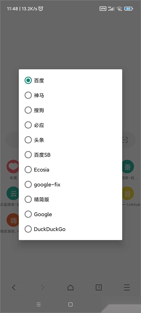 切换搜索引擎可以长按主页搜索框切换,也可以在手势设置里设置长按按钮切换