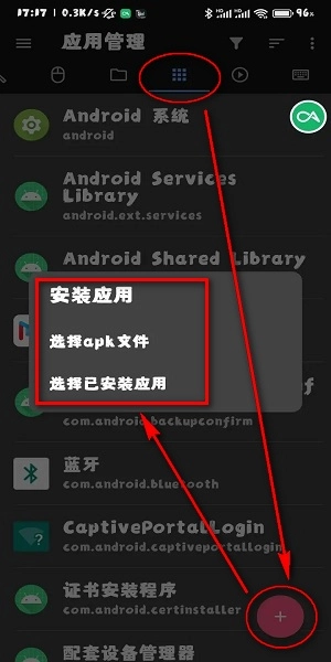 5、完成连接后,在应用管理界面点击上方红框标注的选项,接着点击右下角的“+”号,就能开始使用应用了,点击进入后根据自身需求操作即可。
