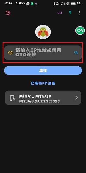 4、进入后打开甲壳虫adb助手软件,在搜索框输入之前记录的地址,搜索结果出来后点击“连接”就可以了。