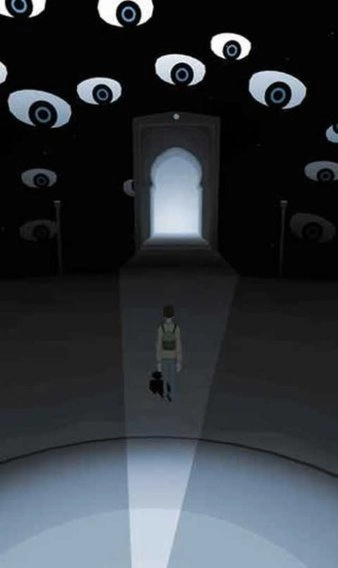 1-进入第三章后,主角出现在一处平台上,远方有个白色影子。他起身追着影子往前跑,跑到前方时,平台中间突然断裂,墙壁上浮现出眼睛,平台也开始改变方向转动。