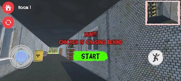 2、新手进入第一关时,建议先操作左侧的方向盘与右侧的跳跃键,跑过绿光墙抵达另一边的安全区域后,再点击Start;此时怪物鸡会立刻冲出来,你能通过右上角的小屏幕查看这只恐怖鸡的状态。