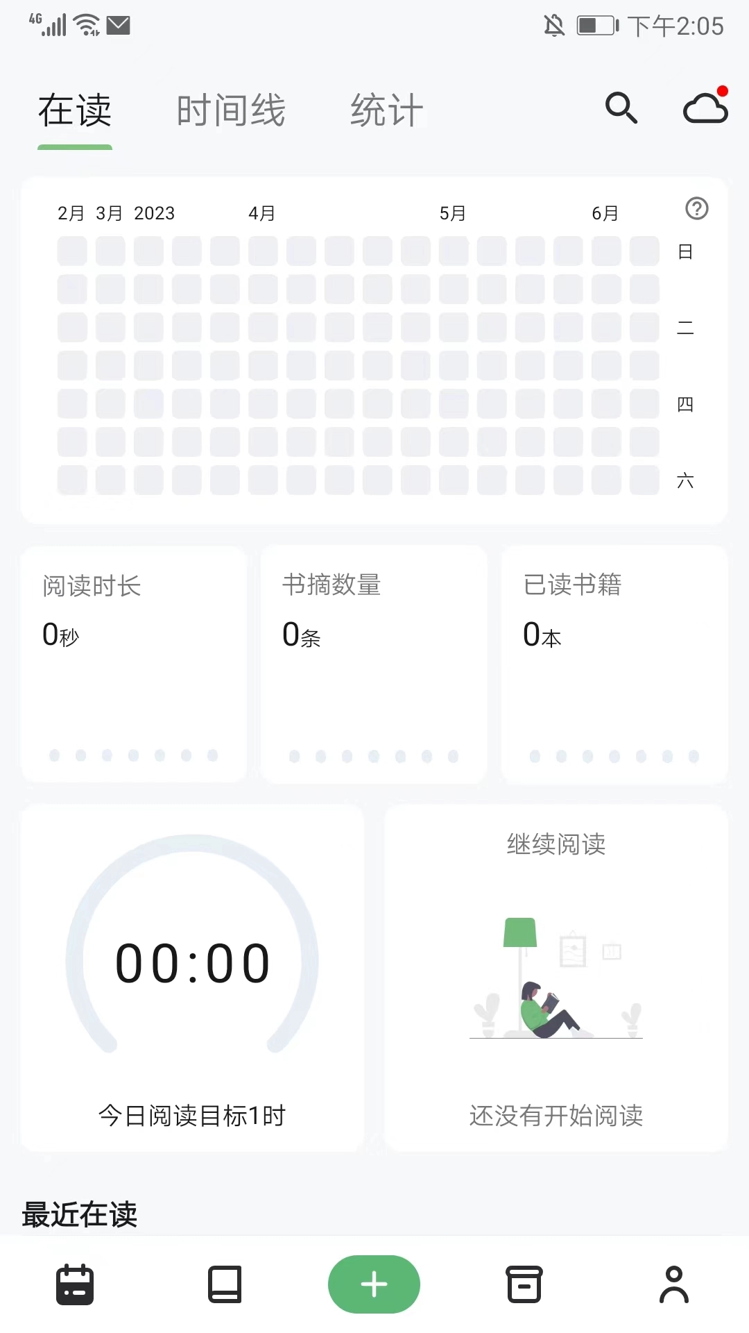 1、打开纸间书摘,进入日历界面后,能查看当前的阅读时长、书摘数量、已读书籍,还可以进行阅读目标的设定等操作。