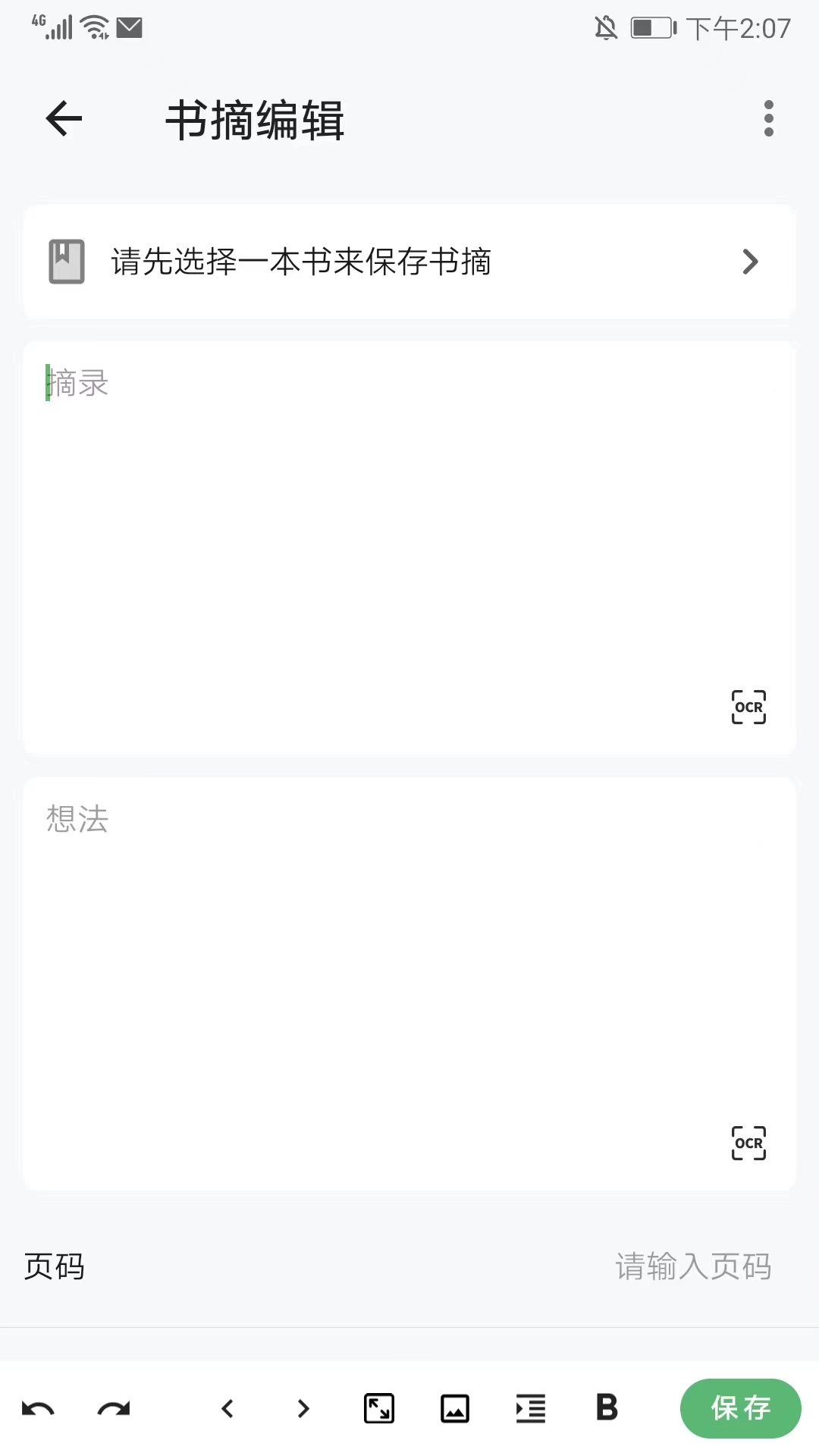 3、进入书摘编辑界面后,我们能够挑选对应的书籍,开展相关的摘录工作以及想法的编辑操作。