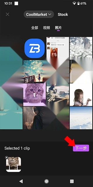 3、打开相册,选择视频或者照片文件,点击“下一步”;