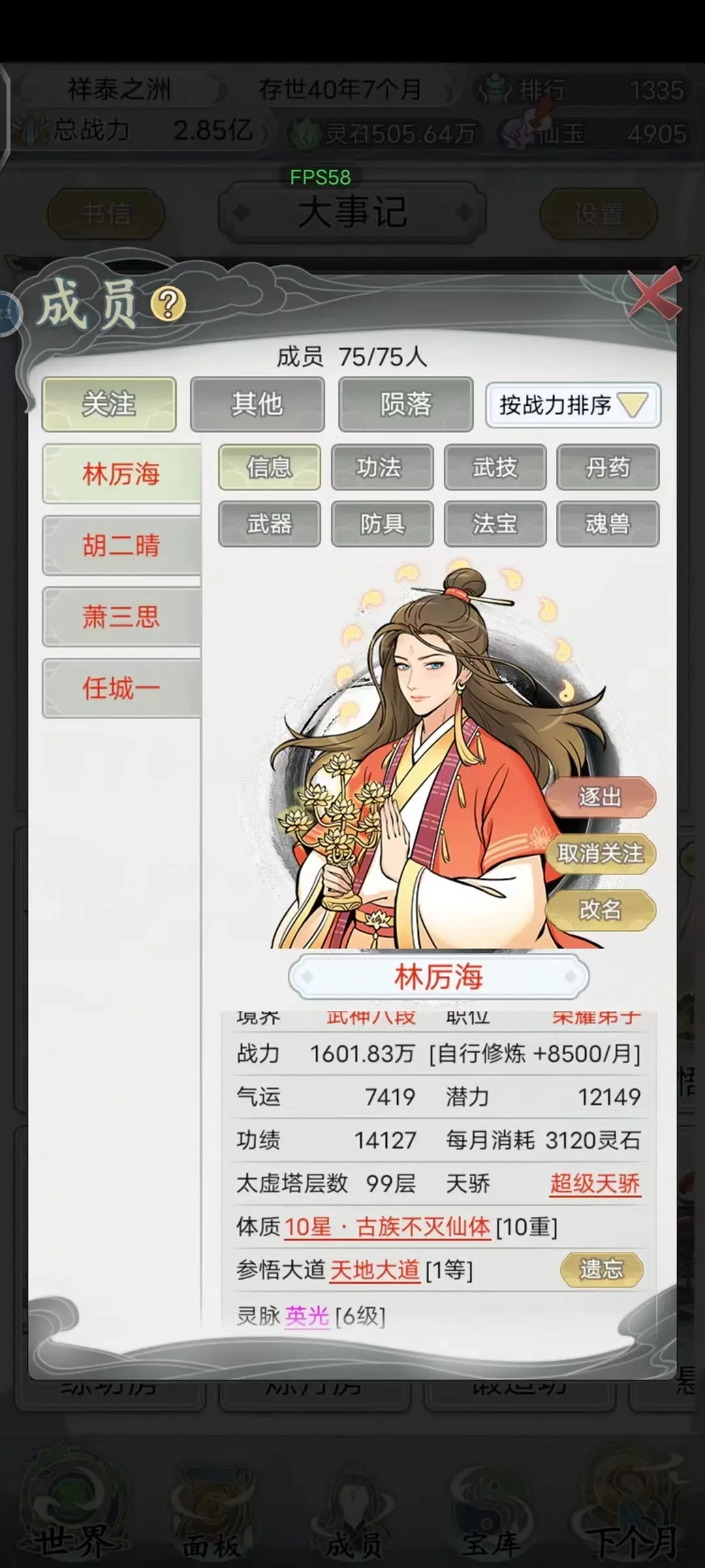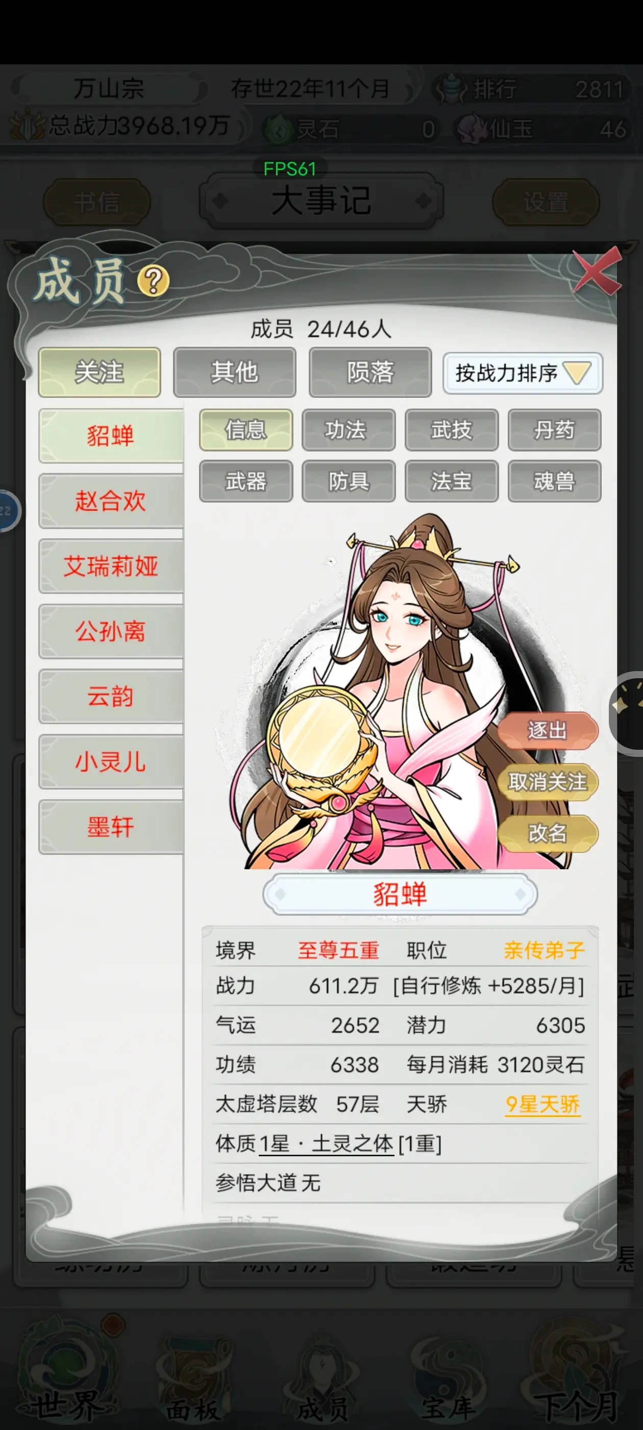 成员:关注成员状态,陨落可复活。
