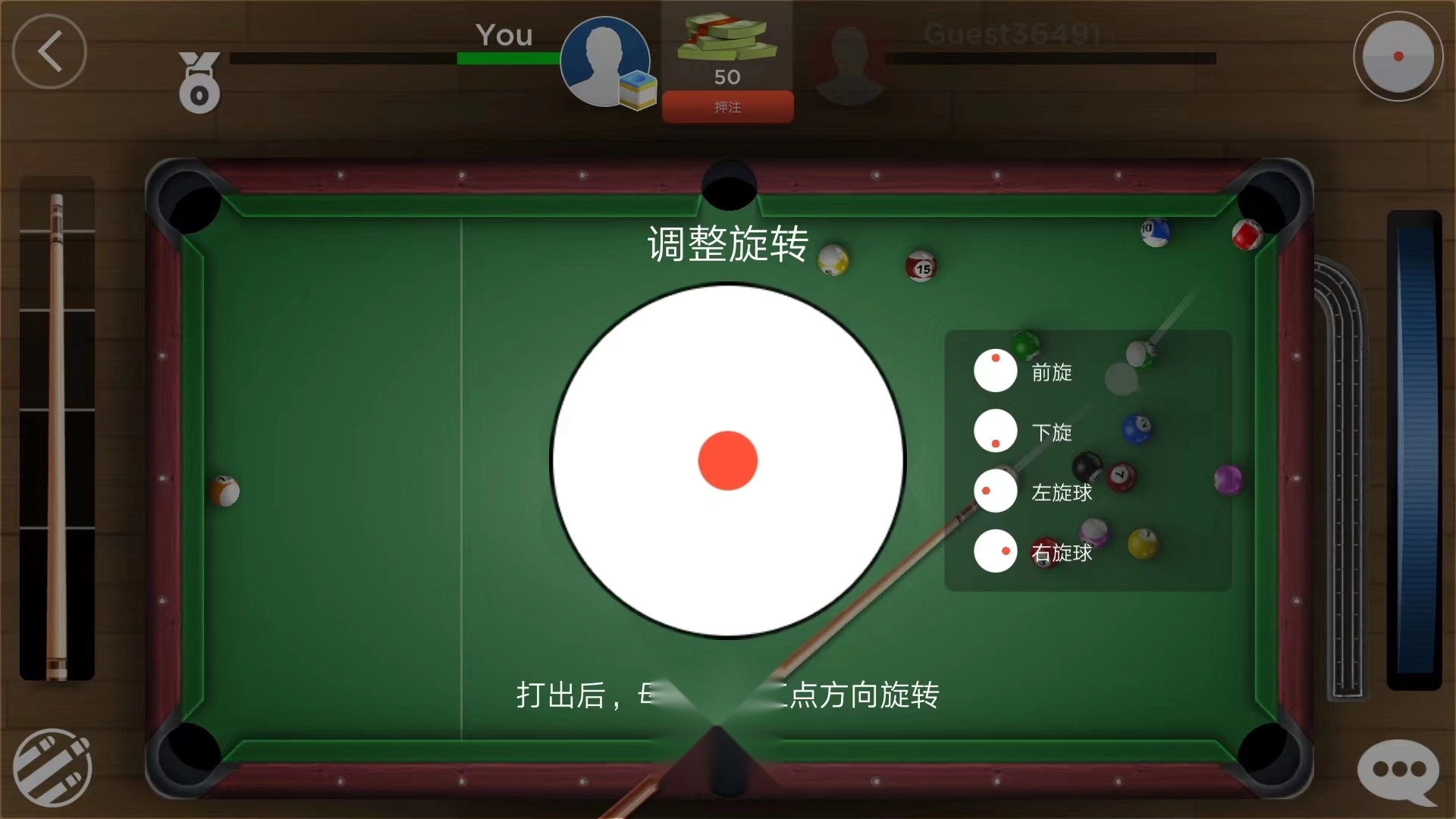 4、我们可以通过调整旋转来调整母球旋转的方向,