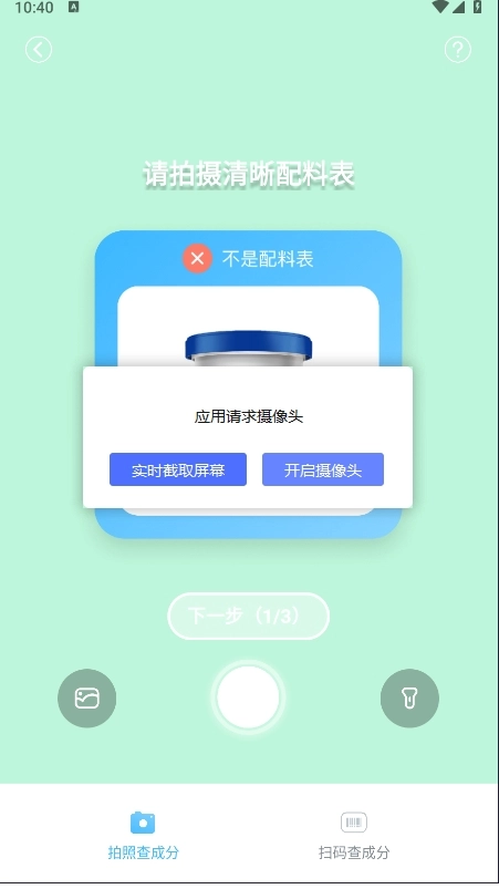 3、打开摄像头对准想要查询的化妆品,对准之后点击中间的“按钮”开始拍照并分析