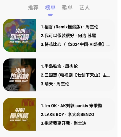 2、浏览音乐榜单:点击“榜单”,查看新歌榜、热歌榜和原创榜单。
